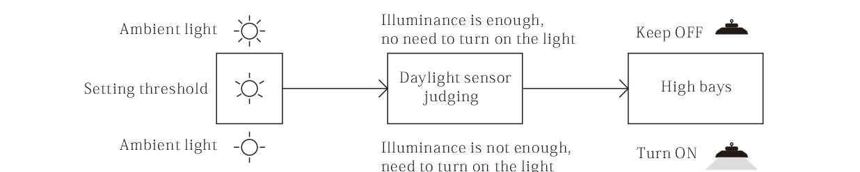 As we all know that, both of daylight sensor and motion sensor can be used to control our high bay lights, to turn on, off, or dim. Let me show you how they work.<br> When a daylight sensor used separately, whose light sensing threshold should be set up in advance, it will sense the ambient light at any time, then compares with the setting threshold (for example, 200lux). If less than, high bays turn on, otherwise, will keep off. So we know that high bays turning on or off, depends on the relation between the ambient light and the setting threshold.