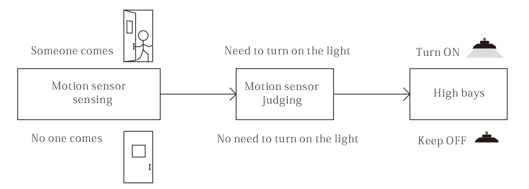 <br>When a motion sensor used separately, it will detect human’s movement at any time. When someone comes, high bays turn on, and when the man leaves, high bays turn off after a preset period. If no one comes, high bays never be on. So we know, it depends on the human’s movement.