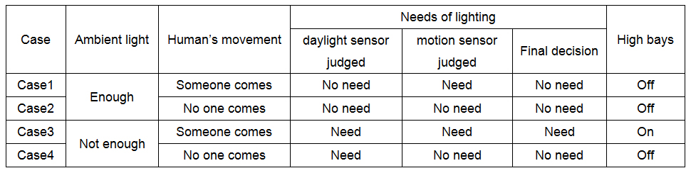 Now, questions come: What will happen when daylight sensor and motion sensor used together? And, which sensor will play the decisive role? Let’s discuss in different situations (case 1~4, please see the form below)